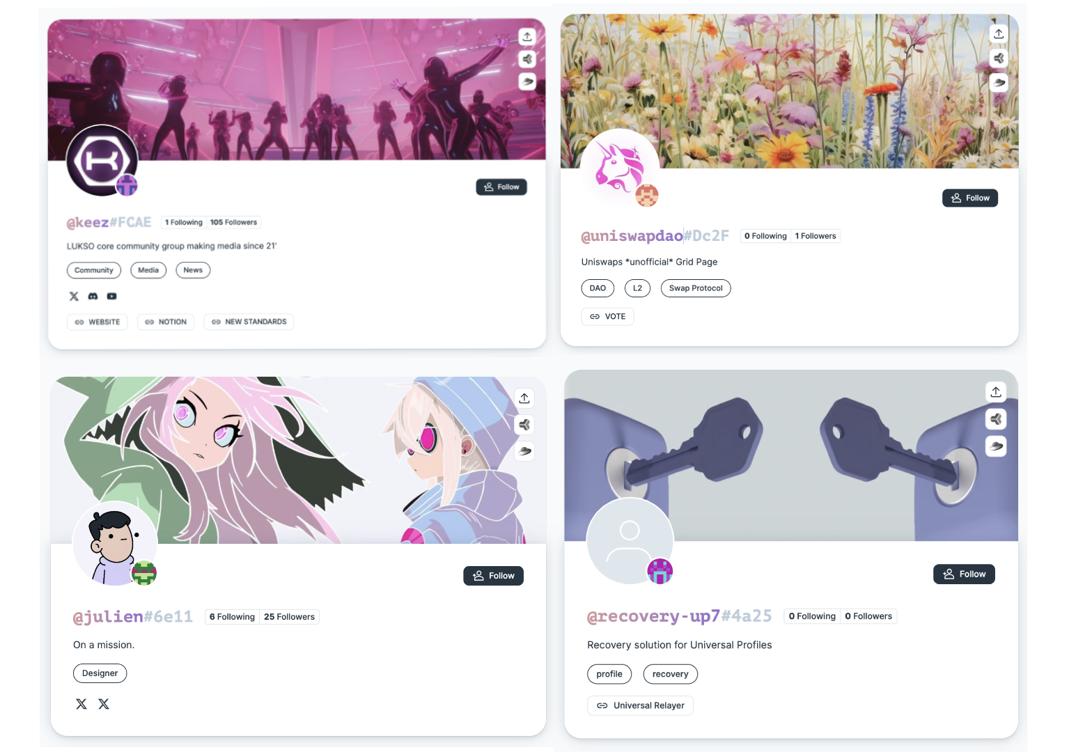 4 x different Universal Profiles used for different purposes (a brand, a DAO, a user's profile, a wallet recovery service).