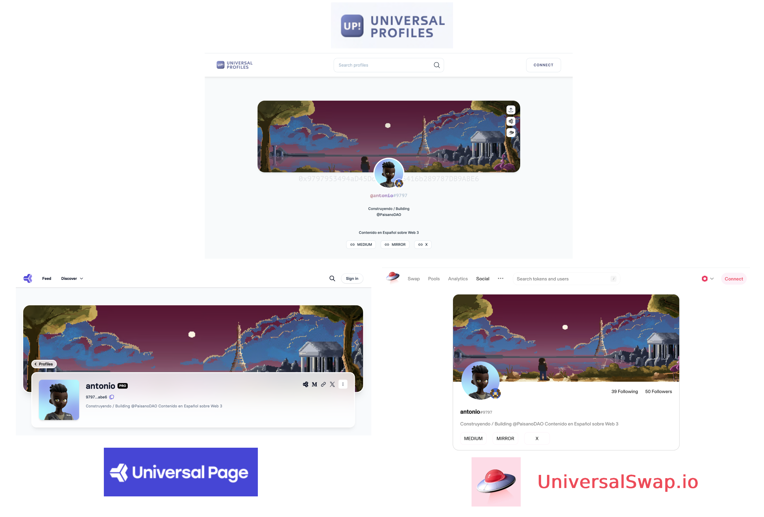 3 x different dApps (UniversalProfile.cloud, Universal.Page and UniversalSwaps.io) using the same Universal Profile data.
