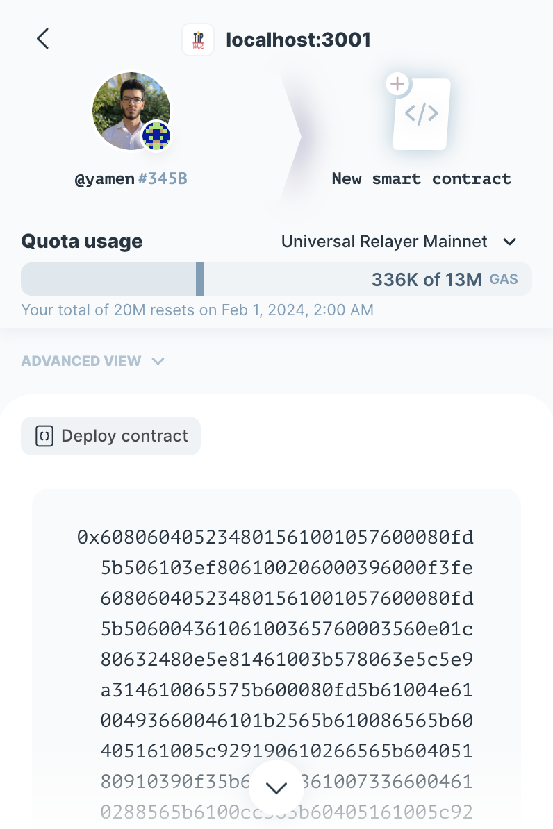 Deploying a contract from a Universal Profile using the Browser Extension showing the bytecode of the contract